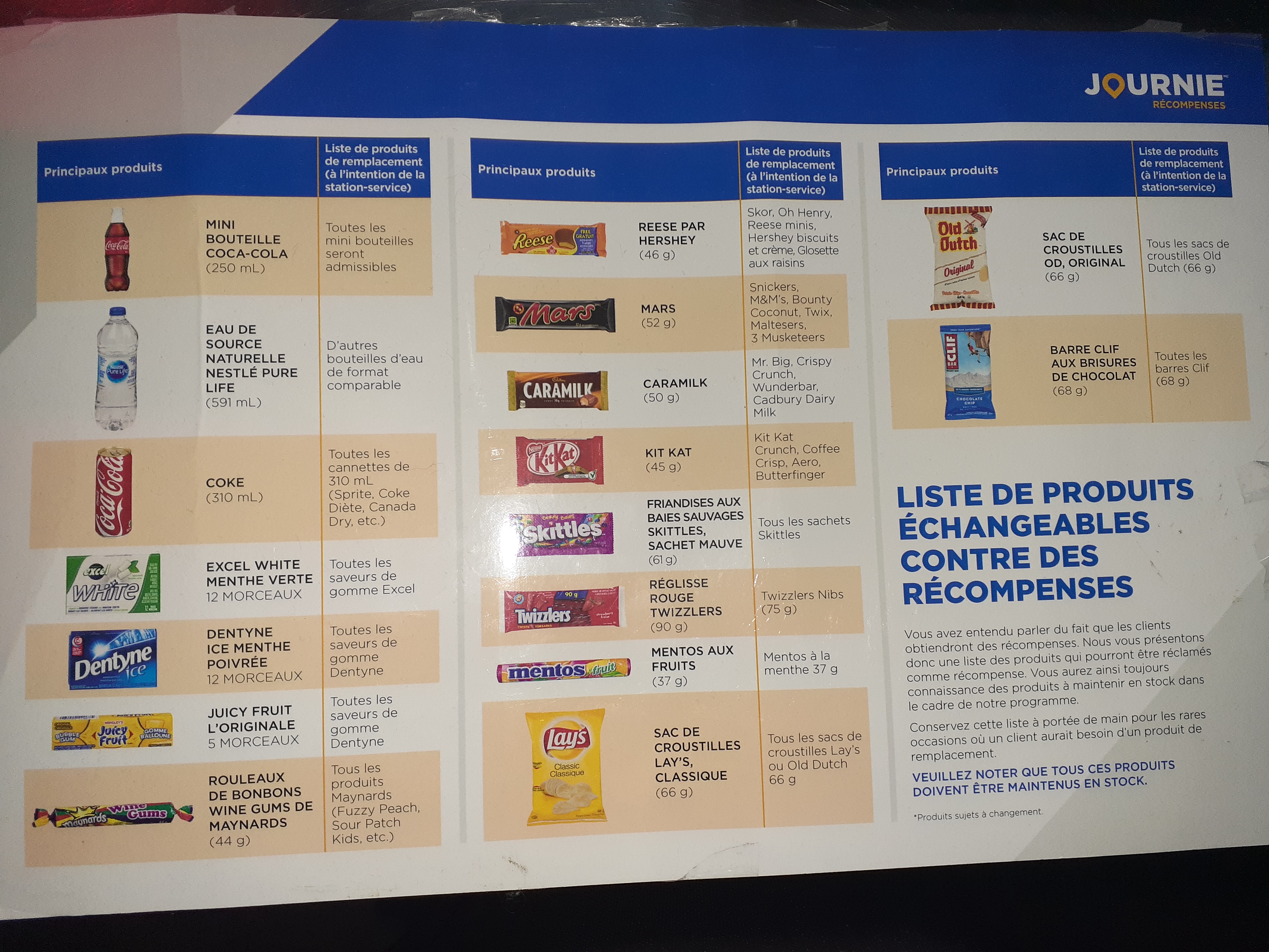 Avec votre carte vous accumulez un point par litre d'essence. En atteignant 75 points et 150 points vous obtenez des récompenses gratuites tels que du chocolats ou un chips. De plus, en atteignant le 300 points, vous obtenez un rabais de 7¢/litre lors de votre prochain plein. Par la suite, on recommence. Mais ne soyez pas inquiets, les points accumulés dépassant les 300 points seront automatiquement retournés au début donc vous ne commencerez pas a zéro.